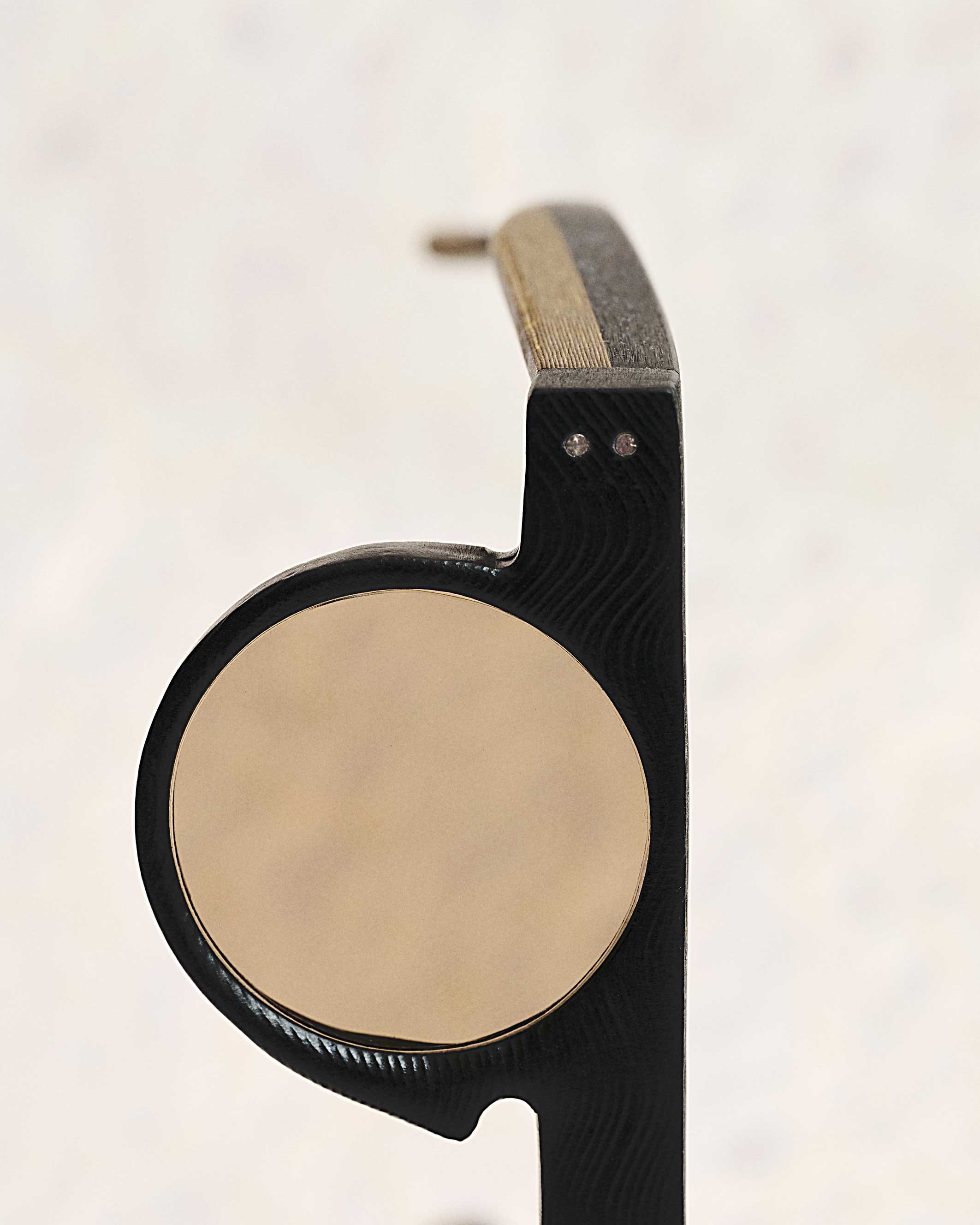 The front is constructed as a rigid structure, then brought to its final form through hand sanding. Rivets secure the assembly. The temple insert slides into place and is locked with a micro screw.