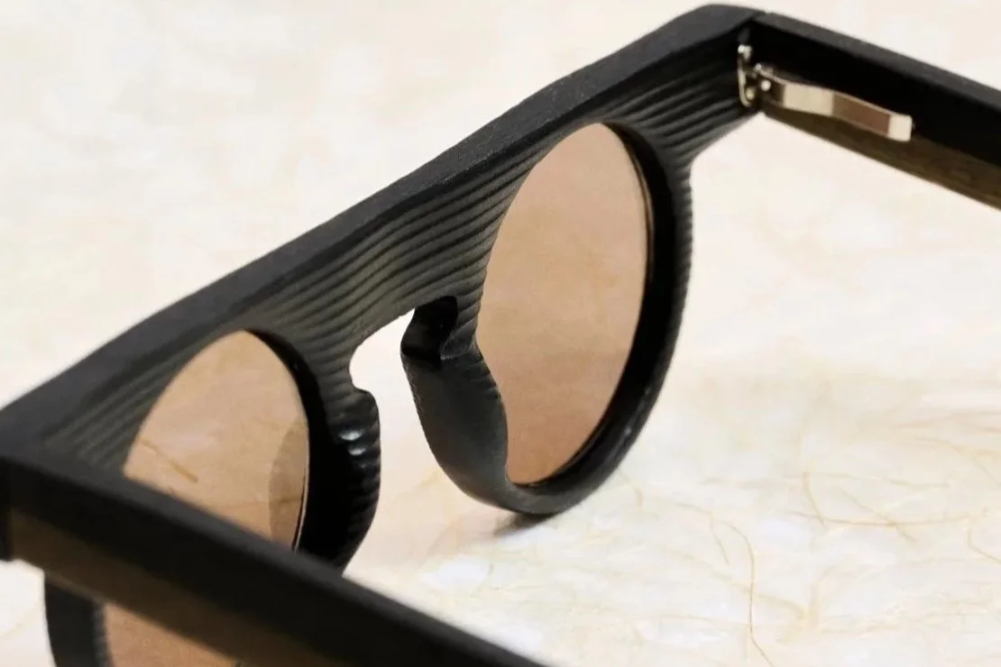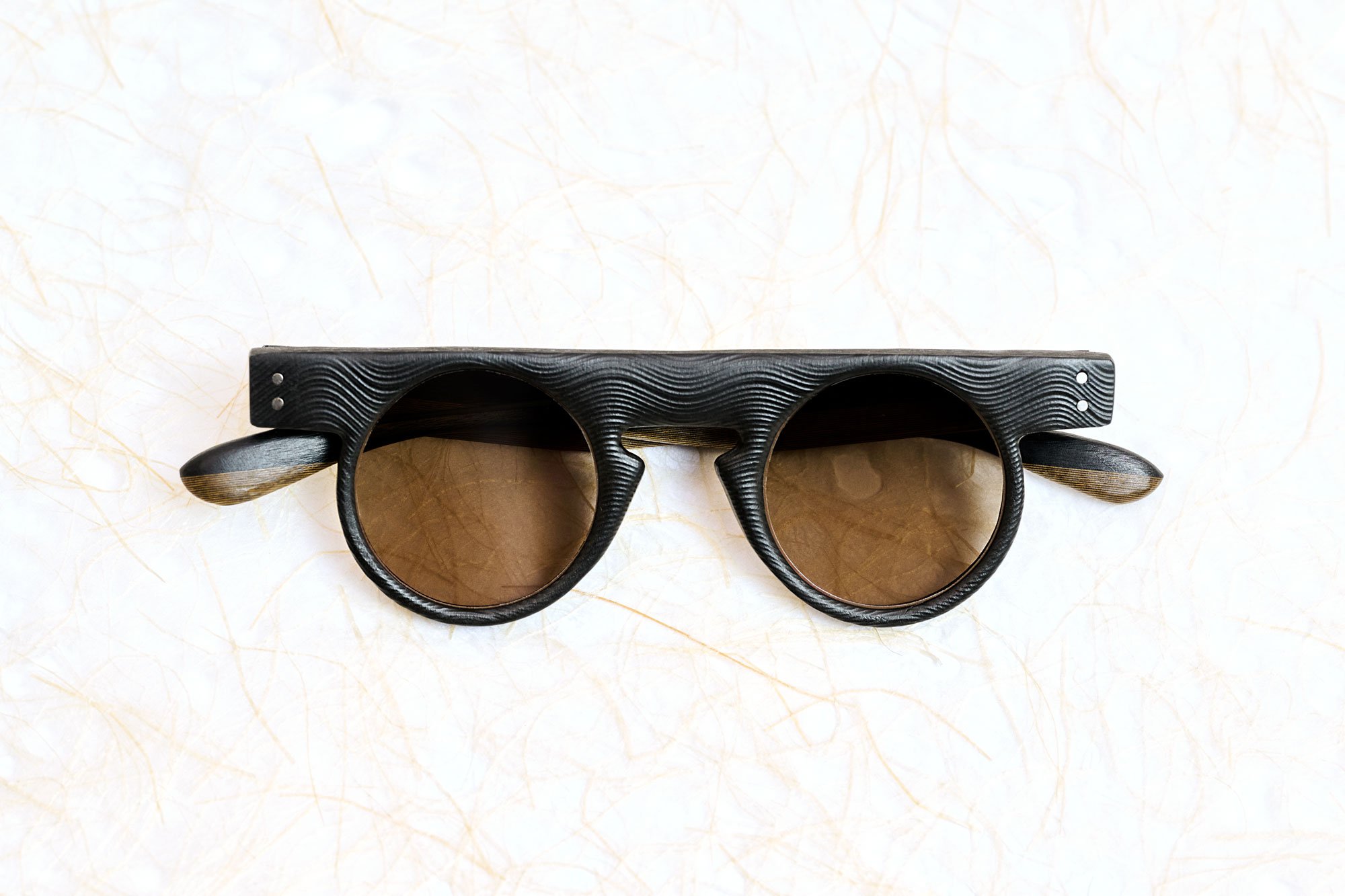 Karesansui lines are cut into the surface, then refined by hand to guide light across the rim and bridge. The texture is not printed. It is made. The front is built as a rigid structure, then brought to final shape through hand sanding. Rivets hold the assembly. The temple insert slides in and locks with a micro screw. Spring hinges are set for controlled closure and repeatable alignment over time. Sun lenses are flat-profile polyamide with anti-reflection coating.