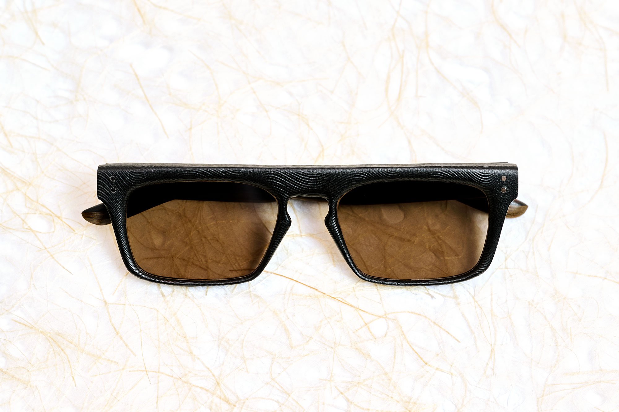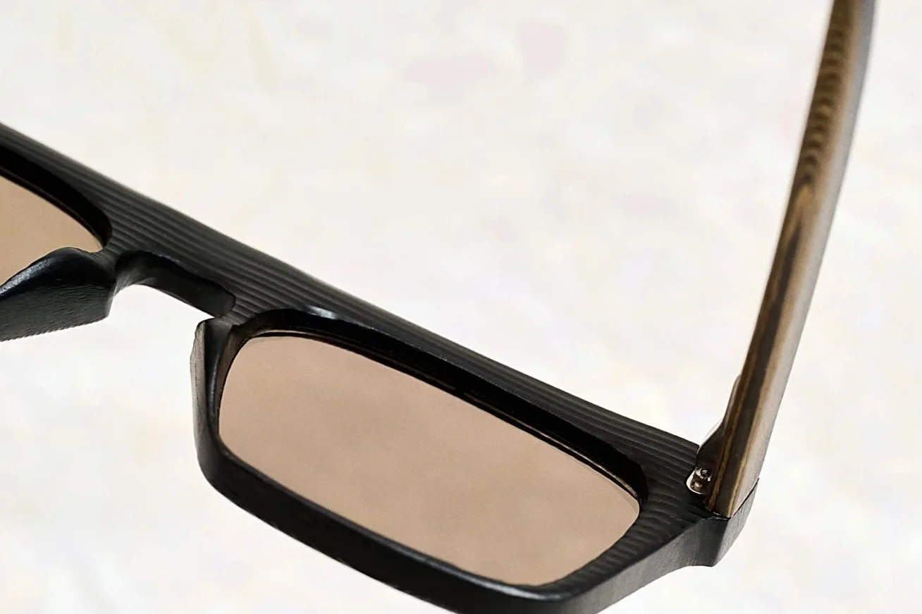Karesansui lines are cut into the surface, then refined by hand to guide light across the rim and bridge. The texture is not printed. It is made. The front is built as a rigid structure, then brought to final shape through hand sanding. Rivets hold the assembly. The temple insert slides in and locks with a micro screw. Spring hinges are set for controlled closure and repeatable alignment over time. Sun lenses are flat-profile polyamide with anti-reflection coating.