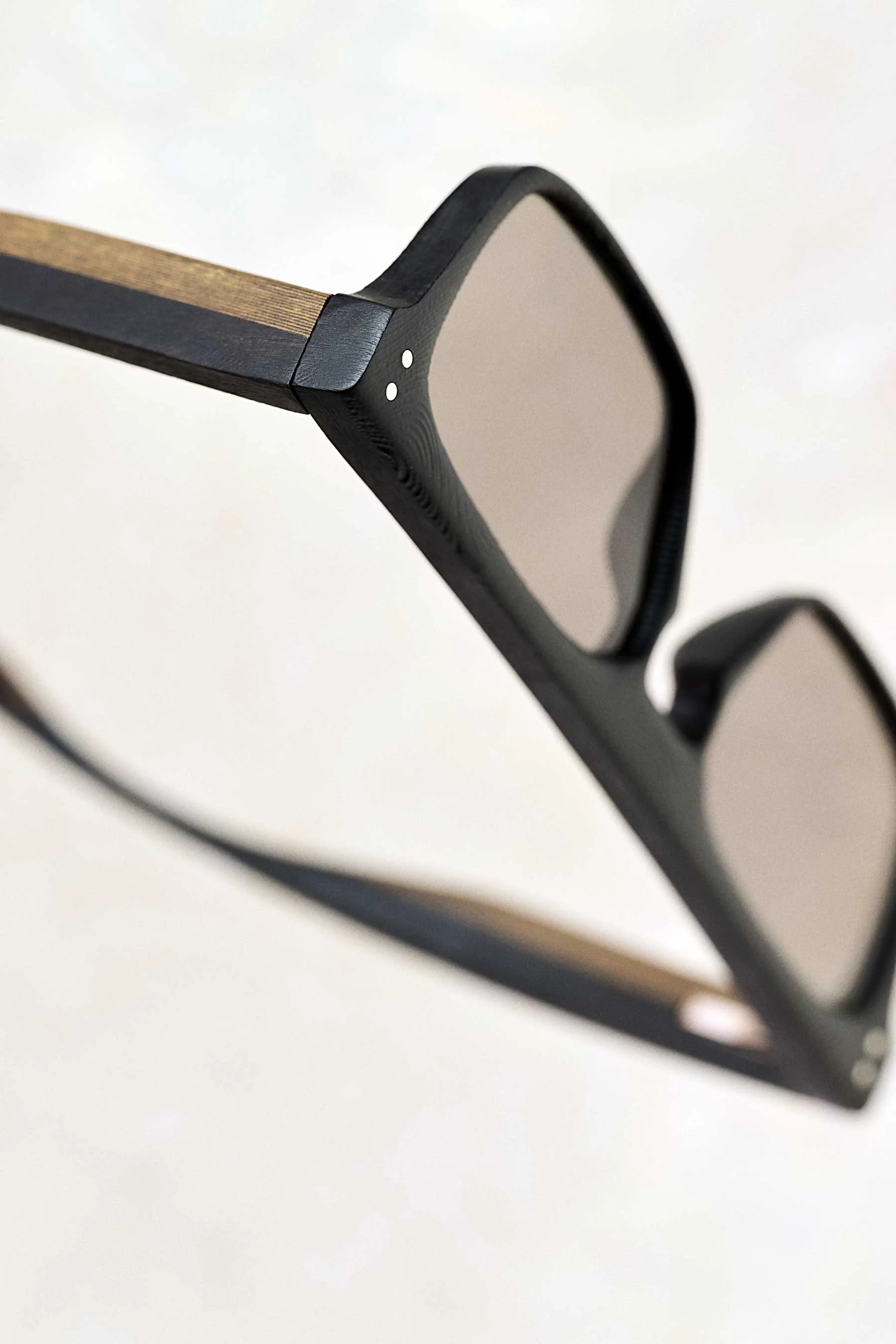 The front is constructed as a rigid structure, then brought to its final form through hand sanding. Rivets secure the assembly. The temple insert slides into place and is locked with a micro screw.