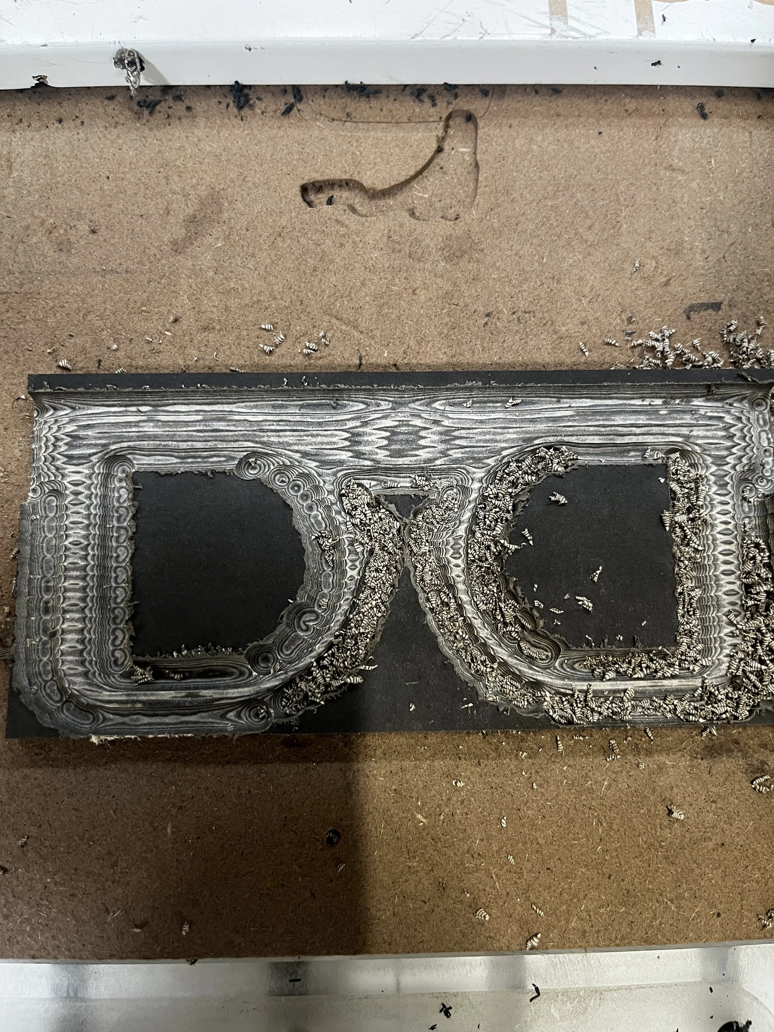 Every frame begins as a flat plate of compressed paper composite. The first cut is digital: exact outline, deliberate surface texture. Lamination establishes thickness as whole. From here, only hands.