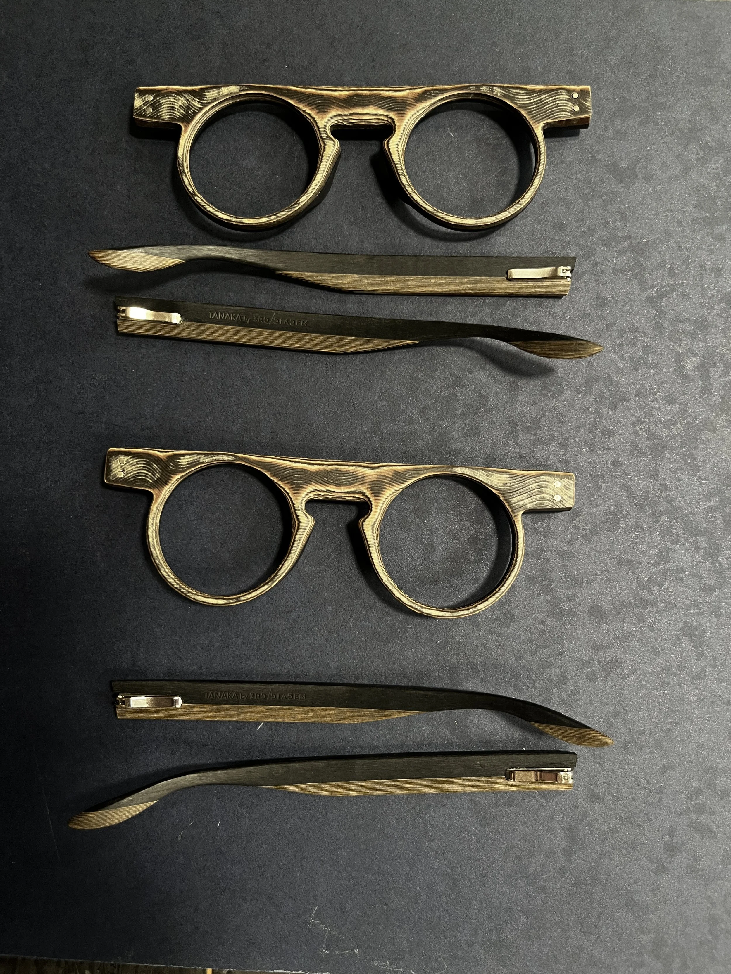Temples are shaped for comfort and economy of motion, then sanded extra smooth at skin-contact areas. The front angle is set one by one; stainless-steel hinges are seated in the front and temples. Assembly is provisional; fit and temple angle are adjusted until the frame sits with intention—balanced to the face.
