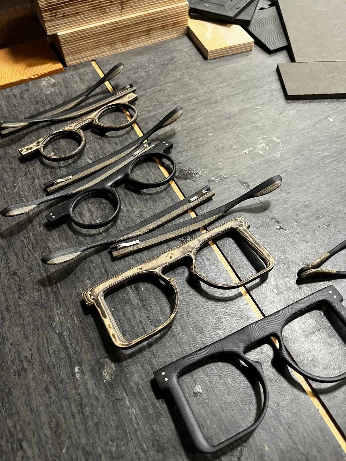 Every frame begins as a flat plate of compressed paper composite. The first cut is digital: the outline, the lens beds, the surface lines. Lamination establishes the blank at full thickness. From here, only hands.